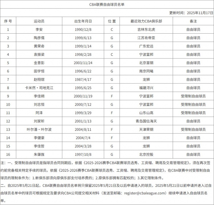 11月17日讯 CBA官方公布了自由球员名单,一共有16位球员,分别是: